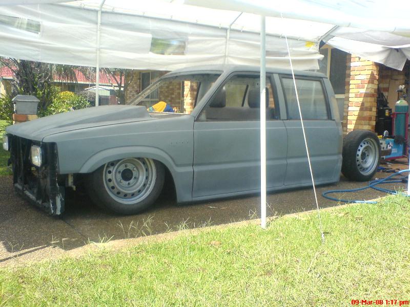2-tone paint, 2 inch body drop, suiside rear doors, iron cross tail lights, fully shaved, full roof sliding rag top, hood cowl, billet grills in grill and front bar, 04 toyota hilux 4x4 front bar
