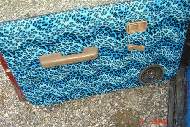 Smoothed dash, painted Black, custom bucket seats, lowered seat brackets, blue leopard door panels, blue shag rug, gtant GT steering wheel,
