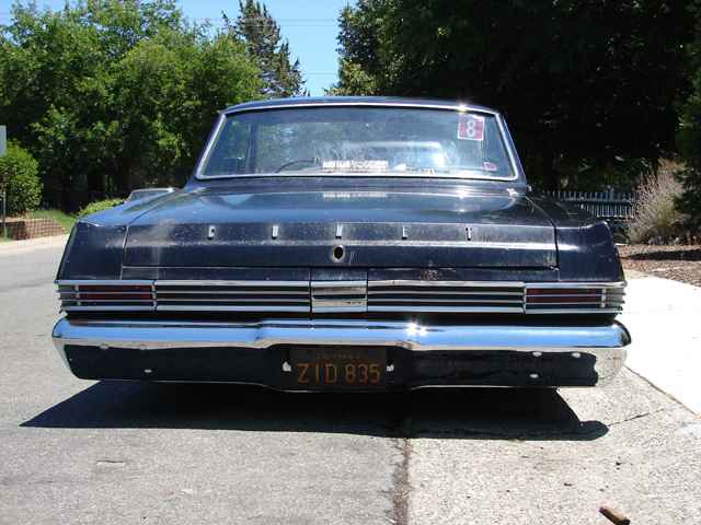 very old black paint job with lots of dents and scratches. Paint is cracking on trunk, faded on front end. removed trim on sides. Fender skirts when they'll stay on...