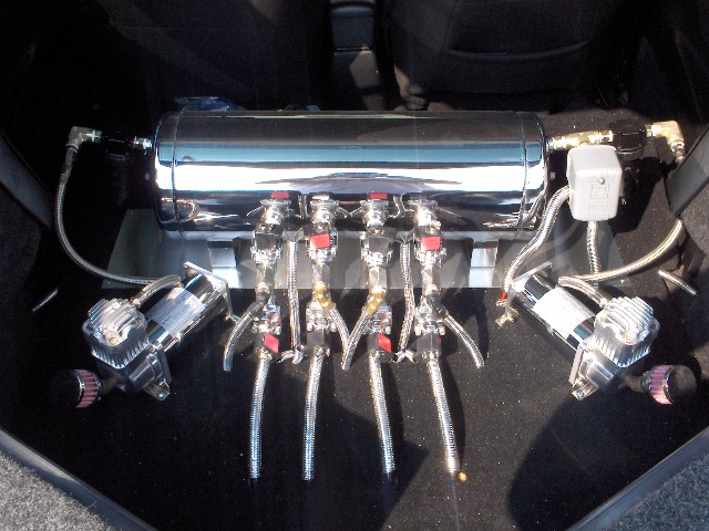 4 BAG STRUTS, 5 GALLON CHROME TANK, 8 3/8 AIR LIFT CHROME VALVES, 2 EASY STREET GAUGES, 1 EASY STREET PSI GAUGE, 2 RELAYS, 2 380 VAIRS, 2 WATER TRAPS,1 SQUARE D SWITCH, 3/8 AND 1/4 INCH AIR LINE.