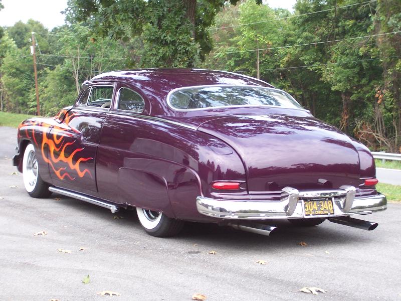 dark purple with hot rod style flames, frenched tail lights, 3 1/2" chop top, billet LED third brake light, shaved handles and what not, 54' front end