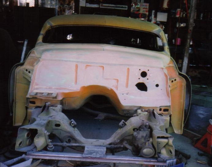 1949 Merc dash with Auto Meter Phantom guages,shaved ash tray and radio,chromed speaker grill.1964 Ford Fairlane console,Mazda 323 front seats.1955 Buick steering wheel.94 Caprice package tray and rear seat.