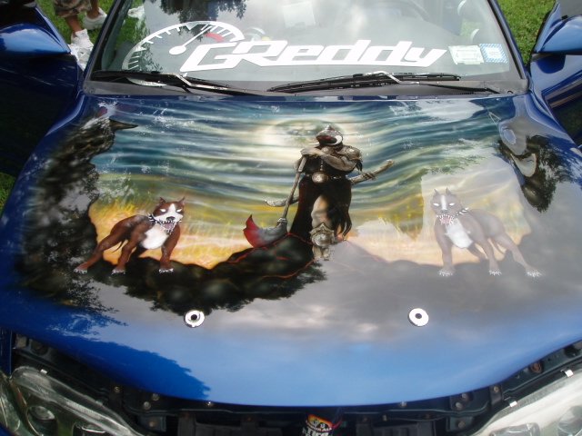escalade blue, shaved rear s2000 taillights, body kit, mural on hood