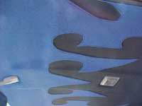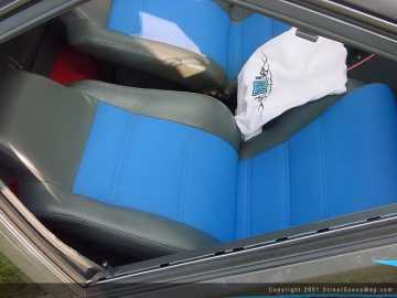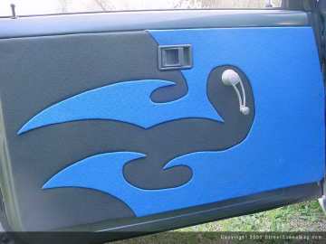 Thanx to Leather Trim Limited of Arlington, TX. Blue and gray tweed mitsu. eclipse bucket seats, custom door and headliner with tribal flames