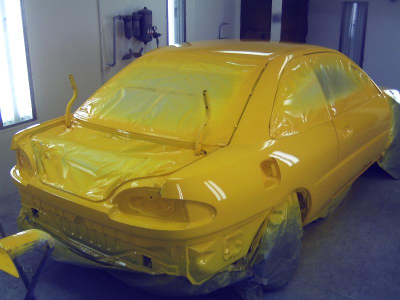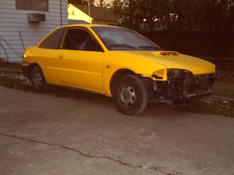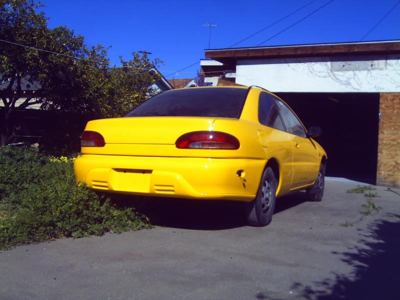 mazda protege' yellow, shaved trunk lock, wrx hood scoop, custom fender spears, reworked front bumper removed the center bars, opened it up and grafted the import screen behind it shaved the liscense plate mount
