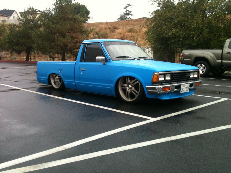 2" drop spindles, toyota hubs machined for nissan spindles. 83 .yota rear end. back half'd bags on bars set up in rear.