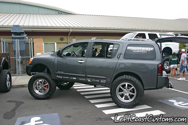 bulletproof front custom made rear, slam rs72 bags on the rear, 2 3/8s valves, 2 firestone compressors, 1 5 gallon airtank, lift all powdercoated to match truck
