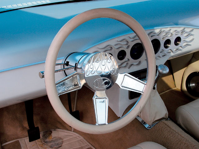 autometer gauges set into a custom fabricated dash plate, ididit steering wheel column,