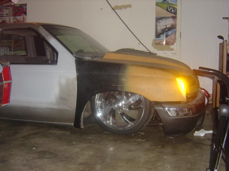 fully shaved,3 color leds in tailgate skin,bagged stock floor body drop,20 inch wheels,custom cowl hood,smooth bed floor ready for paint,04 trailblazer front end conversion