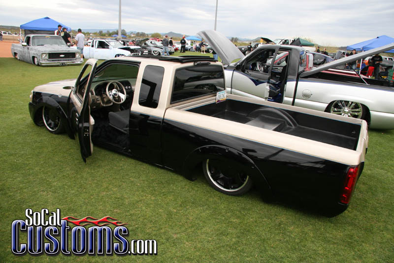 two tone paint , bodydropped , sheetmetalled bed , shaved rollpan , billet grill .