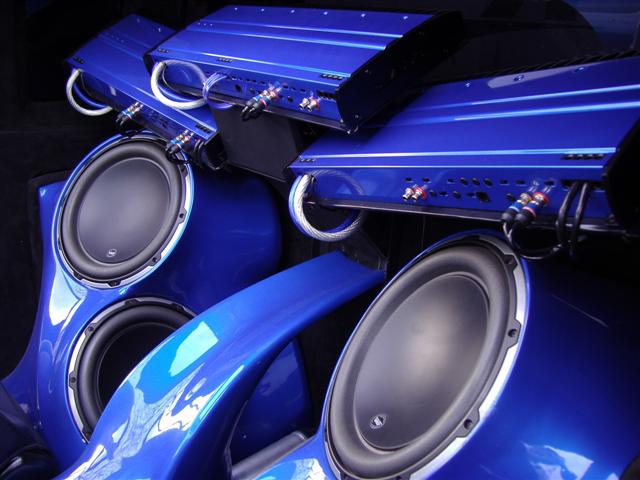 Eclipse DoubleDin 7" DVD headunit. 9" LCD screens in the doors. JL 3 piece component speakers, 1 JL 450/4 powering the mids and highs. 2 JL 1000/1 monoamps powering 4 12" JL W6's. Optima BlueTop. Monster Cable wiring.