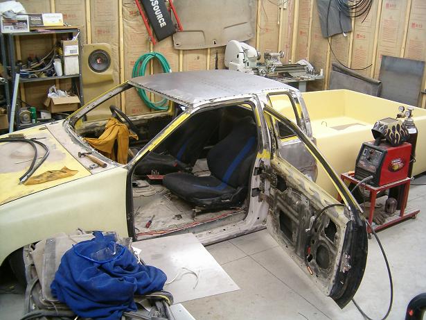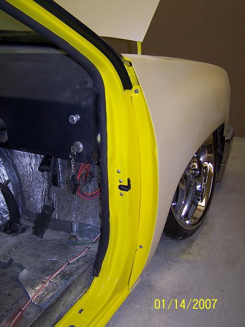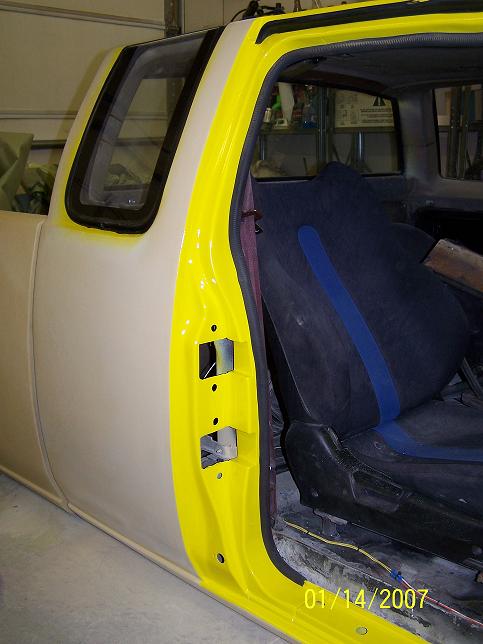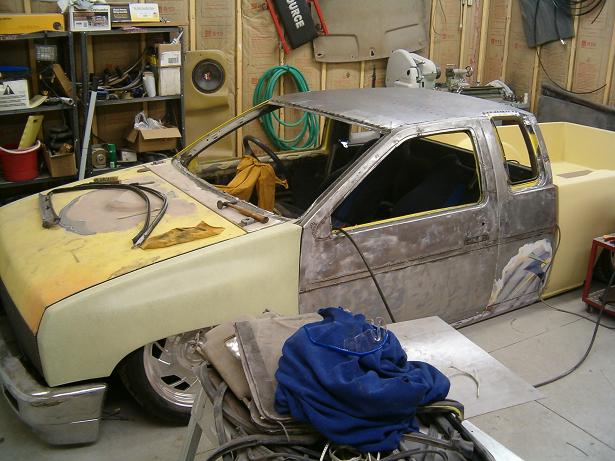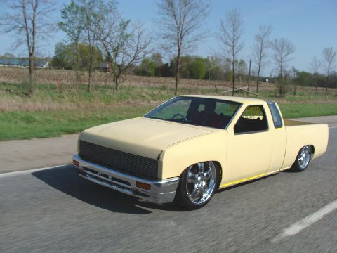 Cab height is 45.5 inches. Rolled fender lips. 2 3/4 inch bodydrop, 5 inch choptop. Shaved handles, mirrors, Nissan emblems, antenna, bodyline, windshield squirters, completely shaved rear-end, cowl, gas filler door, corner markers, re-skinned roof, and smooth firewall. Currently primer on the outside, motor compartment is painted "Dimont" organic yellow over white sealer. Other accessories include a chrome toyota bumper and valence and suicide doors with Bear Claw latches. The inside of the bed is hand fabbed out of 1"x1" square tubing, sheetmetal, and wheel tubs. Two 12 inch L.E.D's are located in the tailgate skin. The brake booster and master cylinder were relocated under the bed and the all the brake lines are stainless steel. I cross drilled the rotors at work on the CNC machine. New tubs were built into the front to replace the old inner fenders. Custom tubular core support. Mud, primer, and paint by JB.