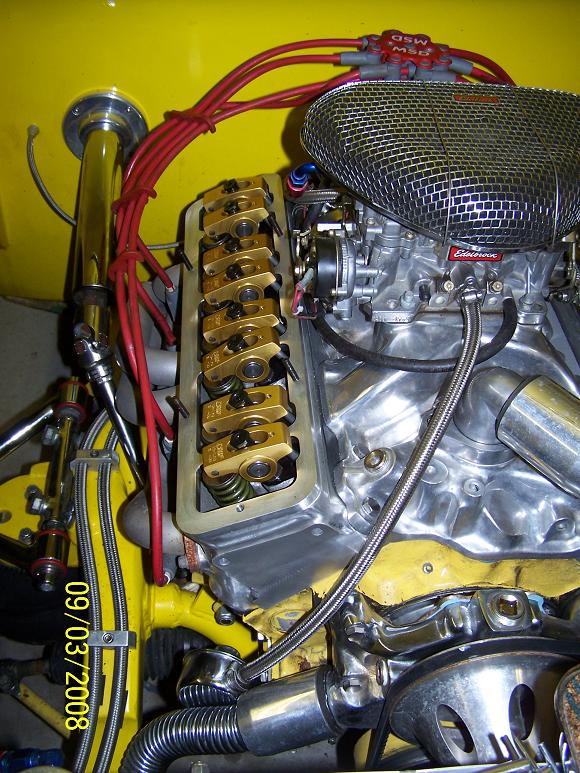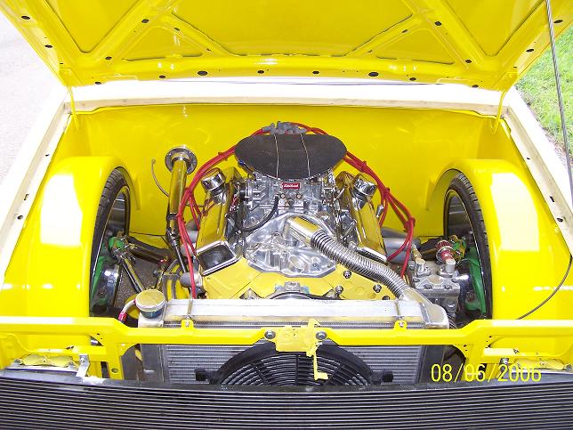 Rebuilt Chevy small block 350 bored .040" over, 58cc aluminum HO heads, Crane Cams aluminum roller rockers, hardened guide plates, Crance Cams hardened puch rods, "Edelbrock Performer" polished intake manifold, 600 cfm electric choke carburetor, camshaft, valve springs, Pete Jackson gear drive, ported and polished heads, stainless steel "Lokar" thottle and kickdown cables, chrome throttle bracket and return springs, stainless steel braided oil dipstick, "Proform" chrome valve covers, valve cover hold downs, breathers, chrome timing chain cover, chrome fuel pump block-off plate, chrome oil pan, chrome heavy duty starter, "Summit Racing" polished aluminum pulleys, ceramic coated "Hedman" hedders, 3 inch "Flowmaster" exhaust, "MSD" pro billet distributor, 6A ignition box, blaster SS coil, 8.5mm plug wires, Moroso wire looms, and a polished stainless steel bolt kit for the motor. Rebuilt TH350 transmission, also painted, with a shift kit and a 2000 rpm stall convertor with chrome transmission pan, "Lokar" stainless steel braided dipstick, stainless steel bolts, and chrome inspection plate. Cooled by a frame rail mounted transmission cooler. 20 gallon aluminum fuel cell with steel braided line and "Earls" fittings, "Holley" Red electric fuel pump. "Summit Racing" aluminum radiator, "Billet Specialties" polished aluminum radiator cap, chrome short water pump, stainless steel flexible radiator hose, "Perma-cool" 16" electric fan, and polished thermostat housing, "Goza" aluminum recirculating catch can. Red "Energy Suspension" motor mounts, transmission mounts, and control arm bushings.