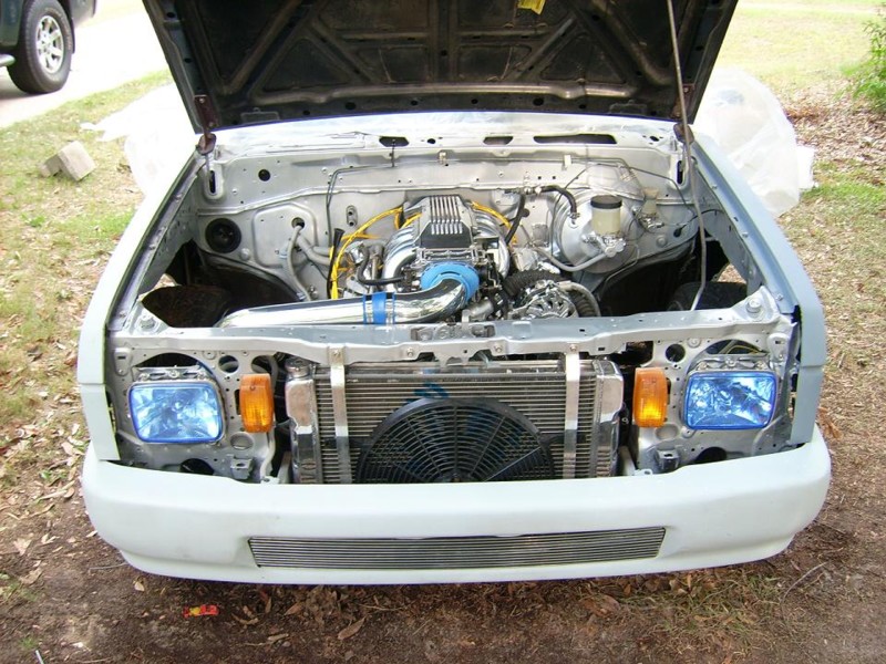 shaved toyota bumper with billet insert, phantom billet grille, H-4 headlights, shaved corner lights, shaved emblems, shaved windshield washers, shaved factory antenna replaced with frenched billet antenna, Mitsubishi Eclipse hood bubble molded onto 93-97 nissan hood, 4x4 fenders, shaved door handles, shaved roof lines, shaved tail lights, tailgate skin/roll pan combo, checkmate fiberglass bedcover.