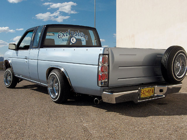 1995 Nissan Pathfinder full front-end swap, chrome door handles, & side mirrors, 2002 Nissan Frontier Tailgate w/ shaved handle, custom spare tire mount, Medium blue phantom top w/ Cadillac Lights, chrome fender trim & gas door, Checkmate fiberglass tonneau cover, euro taillights, Line-X bed liner.