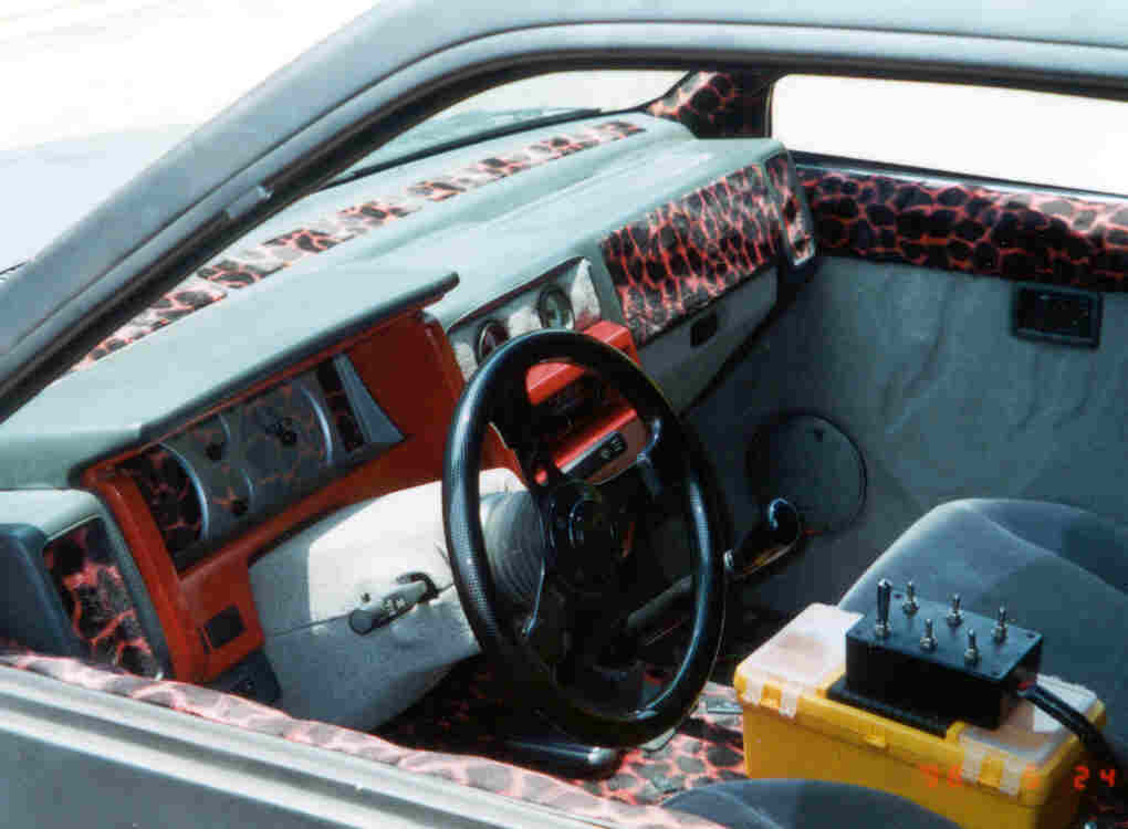WAS red leopard with grey tweed, some blue and purple in various stupid locations (the fags from AMS picked out the interior). I put the dash back in ... just need some help on the seat mounts so i can drag the bitch