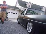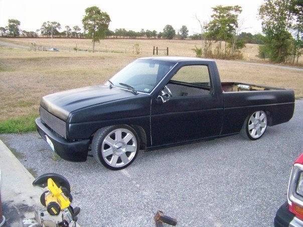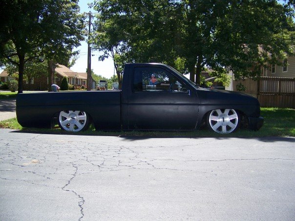 freshly sprayed black primer,shaved doors, wiper cowl, clear corners, fenders been cut down for shaved toyota front bumper with a crooked plate and billet piece, gas tank door, full skin with flamed tail lights, crooked plate, new chrome mirors