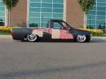 Primer, 2 3/4" Body Drop, Shaved stock Nissan front bumper, cowl, hood squiters, door handles, gas door, tailgate welded shut with skin/rollpan combo, smooth sheet metal skin inside, custom fuel filler inside bed, radiused bed corners all by The Drop Shop, Suicide Doors and Shaved Roof gutters by Kustomwerks