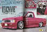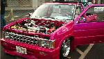 Paint House of Kolors Hot Pink Pearl, Xenon bodykit with fender flares. 1990 chrome nissan pathfinder grille. 1995 nissan hardbody hood. H.I.D. Street Beat ragtop. Shaved door handles. Altezza taillights & clear turn signals. Frenched in license plates. Shaved tailgate handles. Rhino Linings bedliner