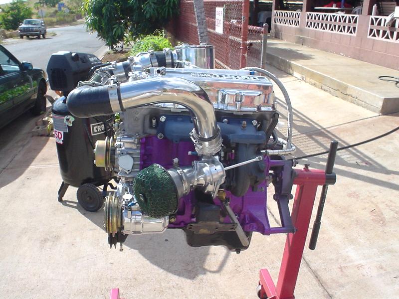 Bored over NAPZ 24 block 40 over.block painted same color as truck. ARP Head & Main studs. balanced and blue printed block. 8.5.1 J.E. Pistons. Total Seal piston rings.Pauter Machine Rods Copper Head Gaskets by SCE.O-ringed cyl. head. Port & Polished cylinder head. Competitions Mild Cam 260 Duration. T3 turbonetics Turbo with polished compressor housing. H.K.S. air filter. Polished stainless steel turbo piping. Vortech blow-off valve. Modified FBI intakes for turbo use. Nissan Bluebird Turbo Exhaust Manifold from 82 Nissan Blue Bird. 15 gallon Summit Racing Fuel Cell. Paxton external fuel pump. -8AN stainless steel braided fuel line. SARD Fuel pressure regulator. (4)24 lb. MSD Injectors . Custom fuel rail for auxilary injectors. Dual MSD 6AL Ignition & Blaster SS coils. MSD Boost timing retard controller. S.D.S. extra fuel injector controller. Greddy Profec Boost Controller. Greddy Turbo Timer. Autometer 5" monster tach with mini shift light. EGT, Boost, Air/Fuel, Volt Meter guages. Mechanical MAN 200 amp polished housing alternator. Greddy aluminum catch can. Chrome coolant overflow can. Hyper Ground System ground wires. Optima Yellow Top battery. Flex-Lite electric fan with chrome shroud. Polished master cylinder & clutch master. Polished Nissan turbo valvecover. Polished intake manifold. Assorted polished or chrome accesories/parts found throughtout the engine bay