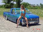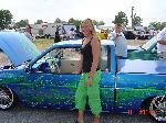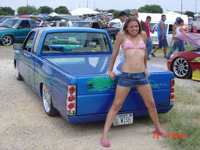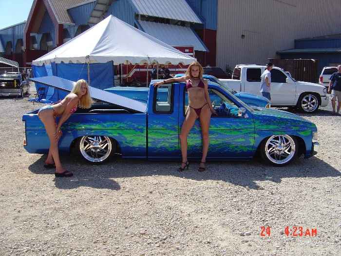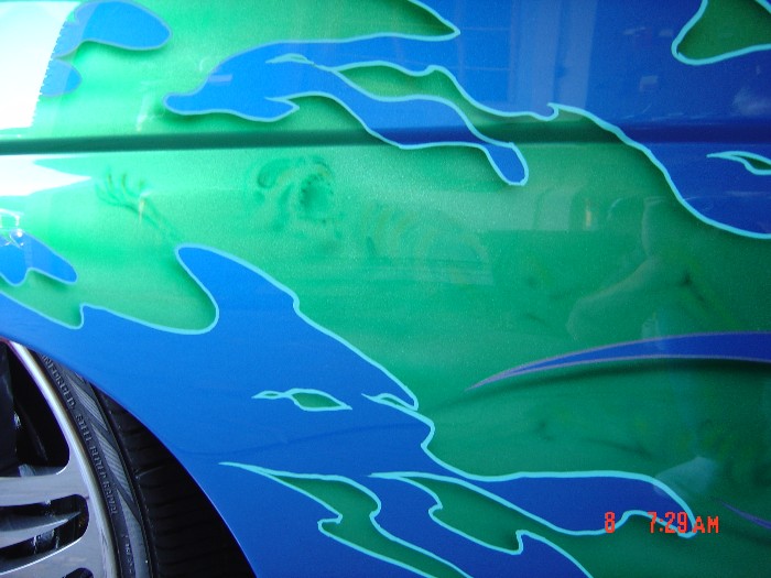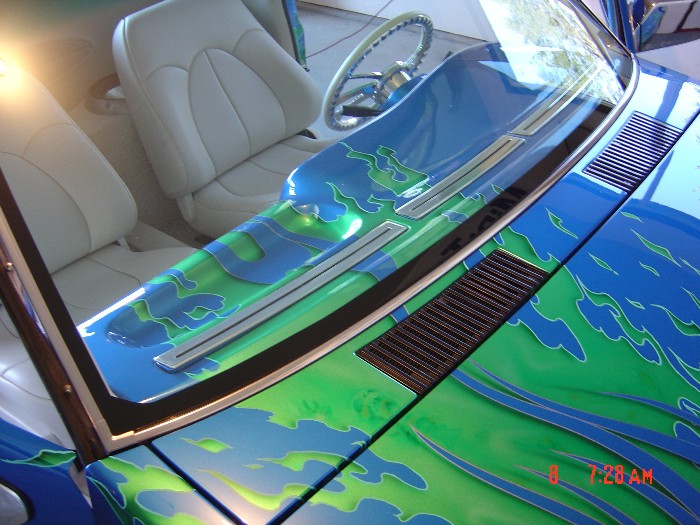 Shaved handles, 3rd brake light, emblems, antenna, roll pan. Graphics done by Charles Armstrong. All body work, base color, and buffing done by owner.