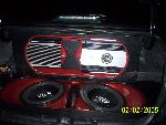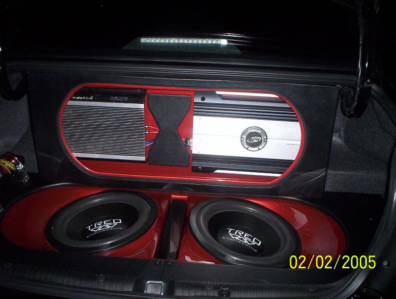 Pioneer 7500 - dvd/tv/cd/mp3/radio, dls tweeters, 6.5 morrels in the doors, and back seats, 2 treo-12 inch subs, MMATS 1400/1 amp for the subs, phoenix gold octane-r amp for mids and highs, custom sub enclosure, custom door panels, custom tweeter pods, custom amp rack, vinyl trim, custom paint, and on and on.