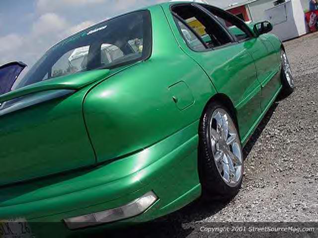 Del Sol green, shaved door handles (all 4), shaved antennea, shaved emblems, shaved ASS end(tail lights and middle plastic piece), shaved trunk lid, honey comb in front painted silver, airbrushed around pontiac symbol on hood, rear deck lid spoiler, , S-10 front bumper clears as tail lights, and Acura Imtegra clears in front