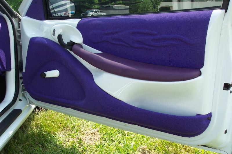 white face gauges, custom purple tweed accented interior, white painted accents, polished aluminum and carbon fiber pedals, custom audio video system,custom made switch panel in center console(for neons,amp,etc), Chrome fire extinguisher in drivers side rear window