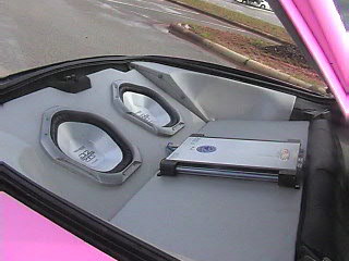 Panasonic head unit, Memphis door speakers (mids and highs) 2 sony hexagon 12's with a Volfenhagen 2000 watt amp, custom box flush mounted with carbon fiber mesh material