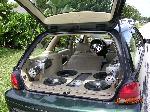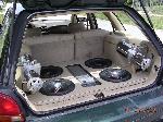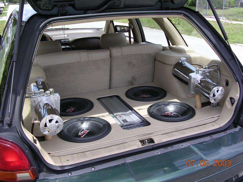 fiberglass sub floor, 4 12 inch kicker comps., alpine mrv1505 on bass, and a alpine mrvf405 on hishs and mids, boston pros, and a alpine head unit