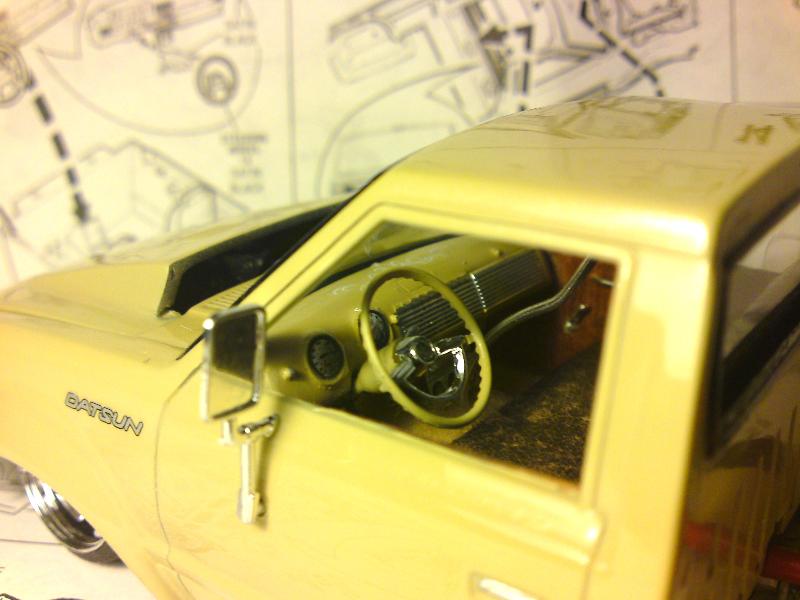 Dark brown leather bench seat, carpet, Wood door panels, '48 Chevy dash and stering wheel