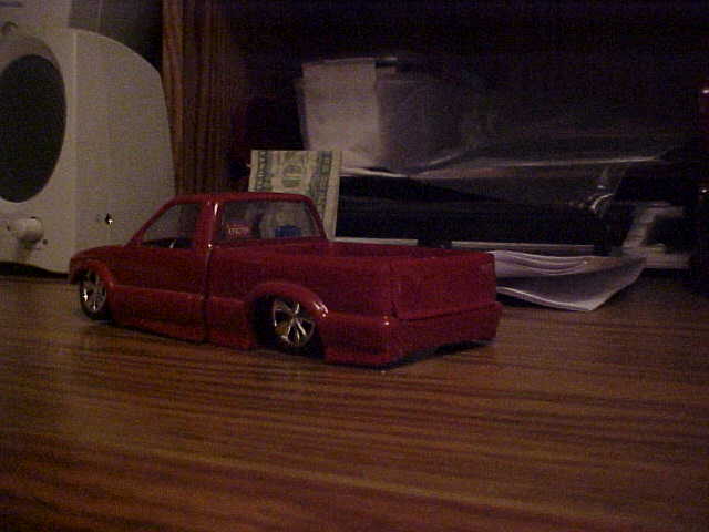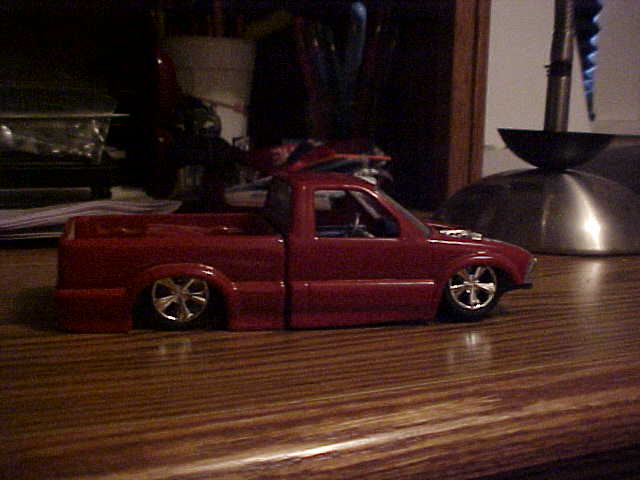 red, shaved doorhandles, tailgate handle, rollpan, body dropped.