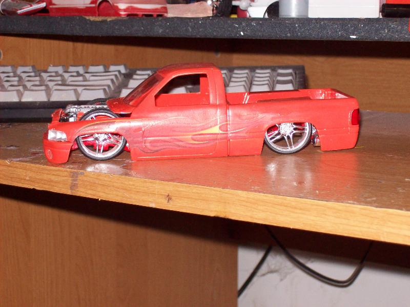 competition orange w/ red an yellow flames,shaved mirrors,doors,third brake light,gas door, fullskin w/ stock tail lights,sheetmetal bed, wheel tubs, an a custom hood to clear the 26s when its closed