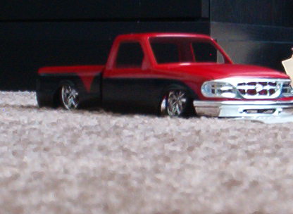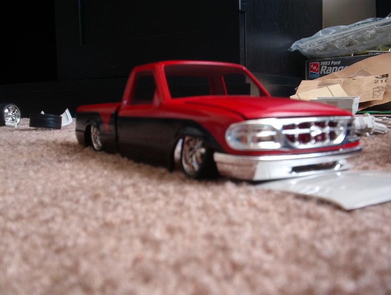 96 explorer front clip, shaved door handles, bodyline, gas door. moulded skin and shaved tails. chrome explorer bumper, explorer hood, painted in a "black widow" theme, but will be changing to red and silver two tone