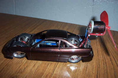 This is a project I had to build for a high school physics class. We had to construct a small vehicle powered by an electric motor and a fan. I used the body from a model Integra and built the frame from aluminum.