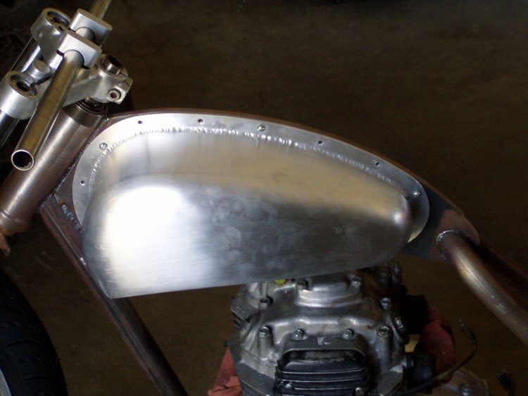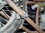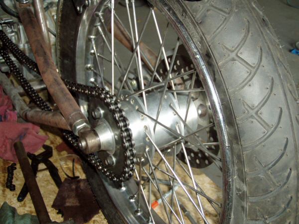 21" x 1.4" front rim (hard to find) on a custom hub to use dual 5" quad rotors. 19" x 1.8" rear rim (started life as a front) on a custom hub.