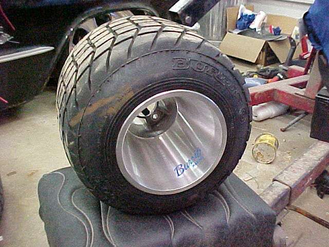 12" wide Burris wheel with treaded tire for rear. Front 20" 3 spoke polycast