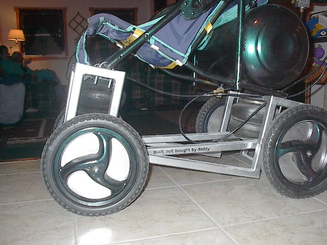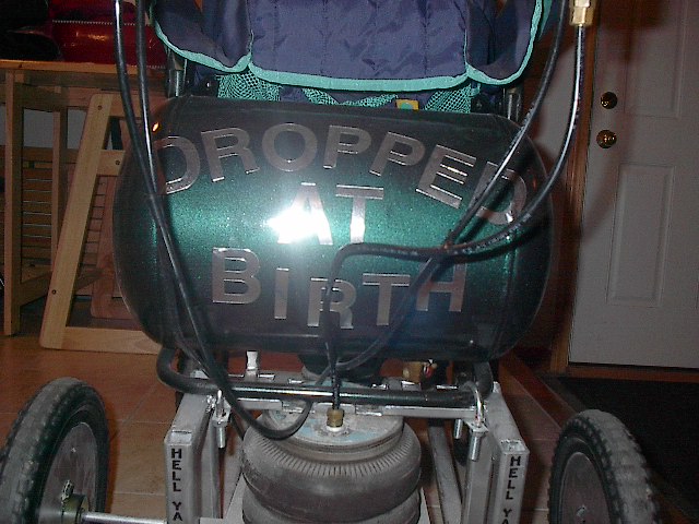 Fully Air Bagged for front to back. All 1/4" lines plummed into some old ass MIC manual valves. Also have a 5 gallon air tank with the words, "DROPPED AT BIRTH", on it. The entire frame is hand built with 1" square tubing. The entire frame lays out and gets a good 7-8" of lift.