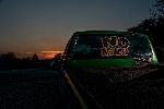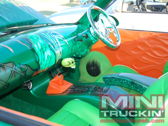 celica bucs green vinyl with a trol hair insert,headliner green trol hair, Door panels orange vinyl and green trol hair , Over head console houses the alpine radio and is orange vinyl and green trol hair, carpet will be green,dash is painted and blank no gauge no radio no nothing moved the ignition switch from column to a nice hidden spot.billet wheel,and misc painted parts. behind seat sub box that houses 2 pioneer 12" subs in a ported port thought cab box. With a fiber glassed face and center console finishing touch.