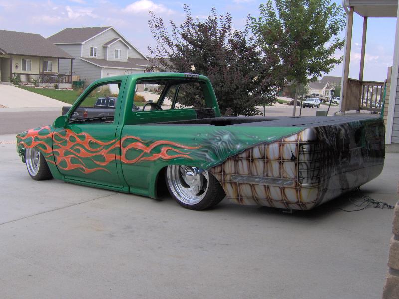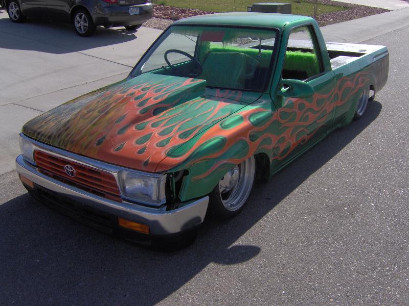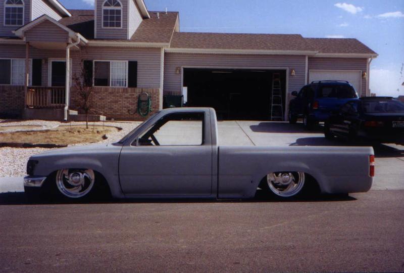 truck was a rolled total when i bought it 2inch bondo on roof cab sides bondoed with doors to make them straight 1-3 inches there the guy never tryed to fix the bed but looking at it why try? now it has a new cab 2 new doors new bed new fenders new hood new rad support new lights O did I say that every piece of metal was taken off the og body and trashed now to what is done to the new stuff. 3 inc body drop,4wd fenders,shaved firewall,doors, used 96 civic clutch master and yes it fits and works perfect,92 4runner front bumper and lights. sui doors ssd kit works really good .Well I cut the hell out of the firewall for the rhd thats done and ready for paint.I just started the sheet metal work in the bed. Fiber glass cowl hood unlimited products took 3 1/2 month to get. Then 2hrs to make the latch work so it would shut. Im not that happy with the hood. Smoothed cowl. GETTING PAINT NOW!!!