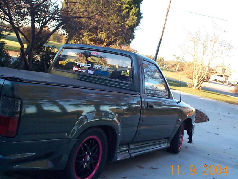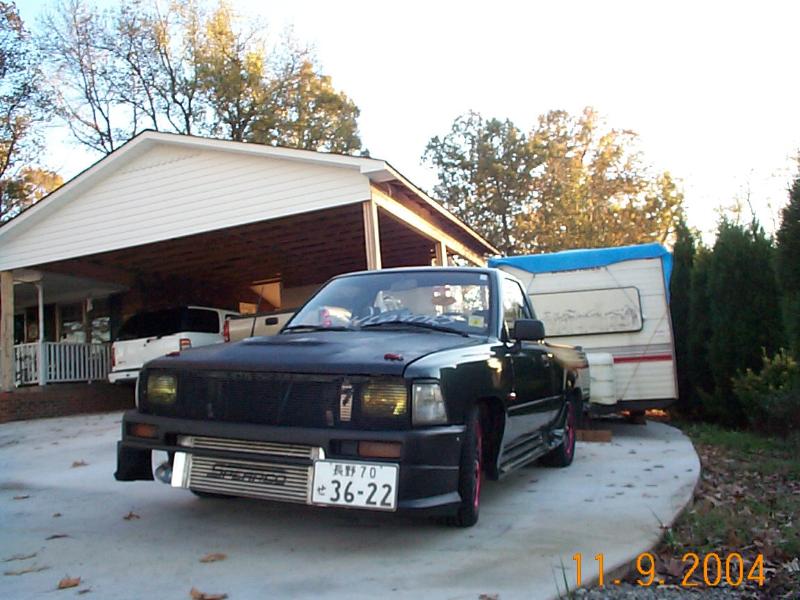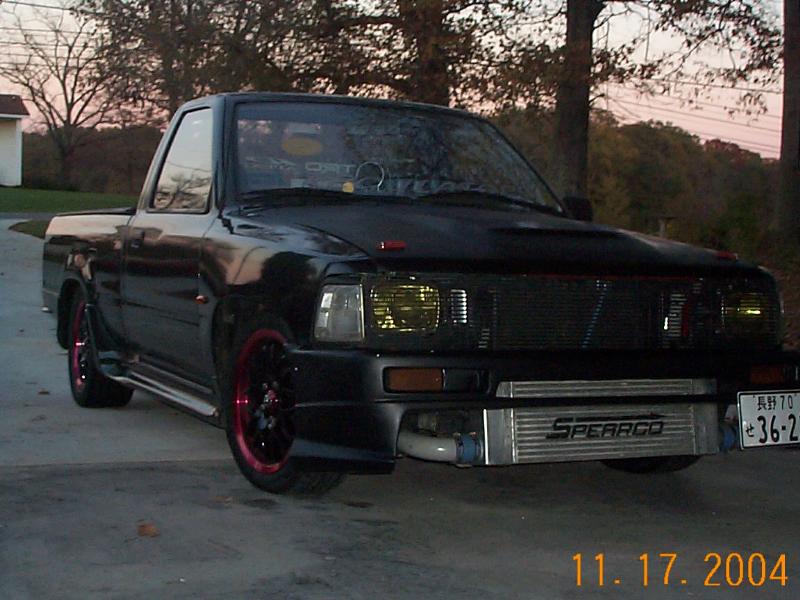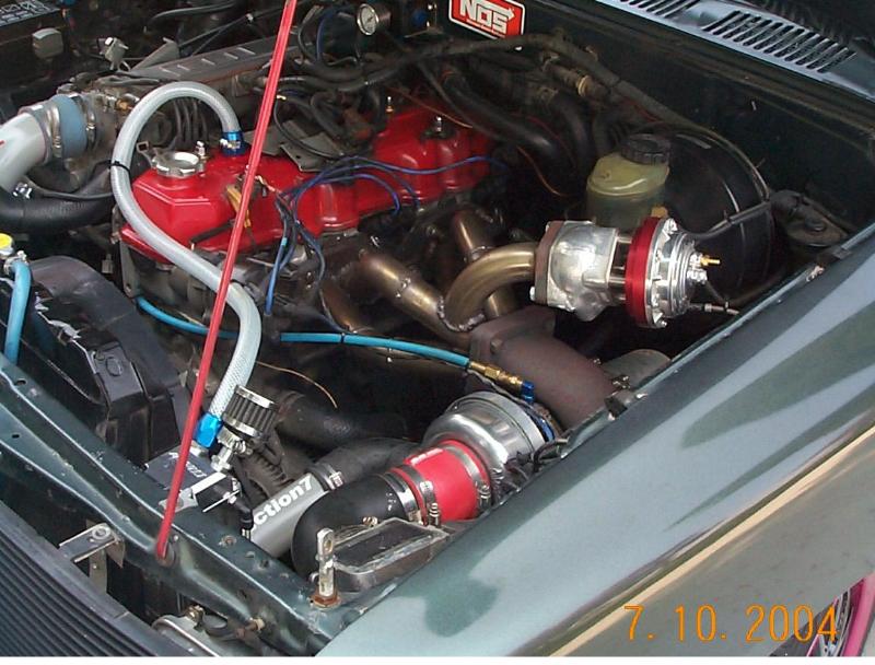 22re...Airesearch t04 turbo,custom stainless steel header,Turbonetics 42mm racegate,custom 4 inch downpipe dumped under the cab,spearco front mount intercooler,2.5 inch intercooler piping,blitz super sound blow off valve,Greddy profec B spec 2 boost controller, Greddy turbo timer,apexi safc 2,holley fuel pressure regulator and a holley 255lph fuel pump,nos dry single fogger kit,act stage 2 clutch,for now I'ma boost and spray til' it blows,then I guess it will get built to handle alot more...we'll see what the future holds!
