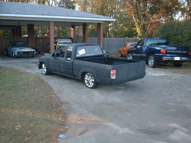 shaved bed ,euro tailights,shaved tailgate,molded hand made roll pan,shaved door handles molded in mustang hood scoop,4x4 front end,4x4 fenders,shaved cowl,shaved gas door, lots of primer balck and now changing to gray just for a change of scenery