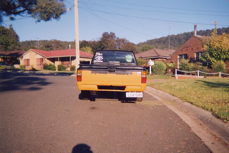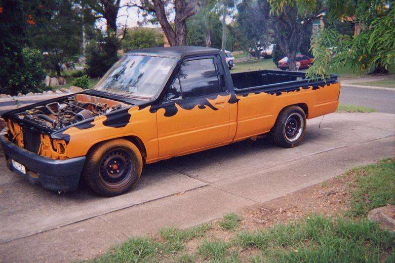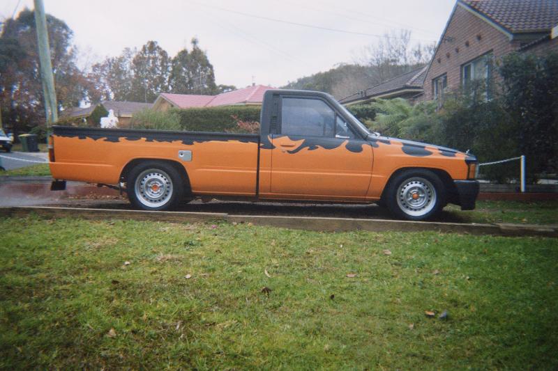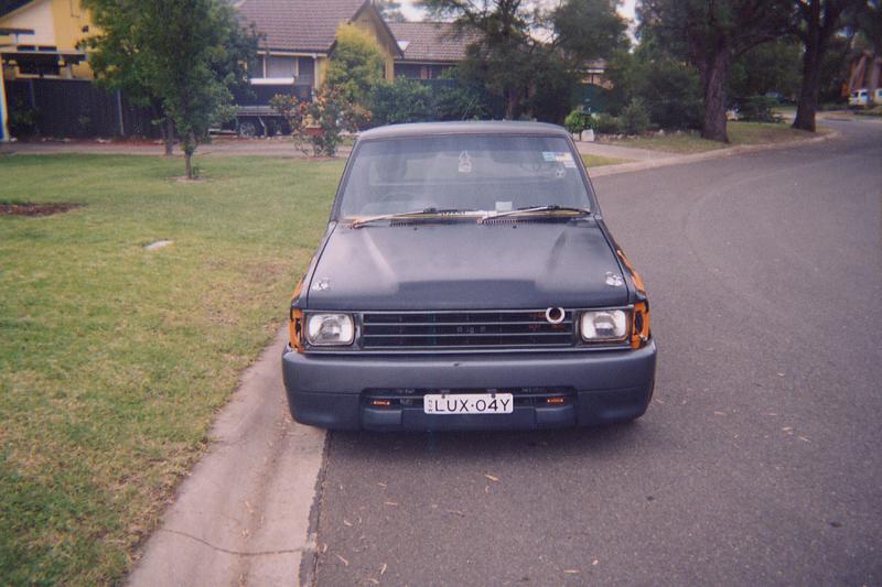 Was a Midnight Metalic Blue and then an undercoat gray. Now a Jet black and Burnt Orange. With a nice big hole cut in the bonnet, pushbike mirrors and a welded up tailgate