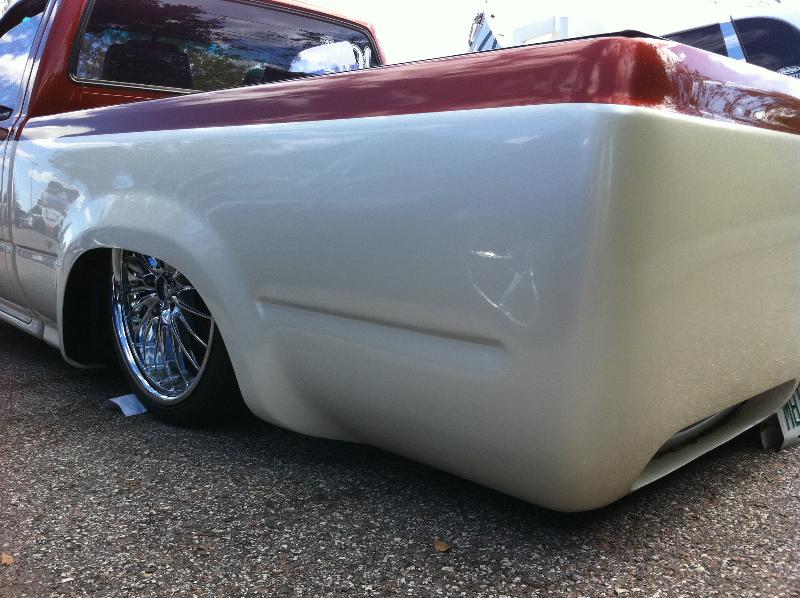 Two tone copper up top with some flake and escalade pearl white on the bottom. Shaved rear tailgate Toyota Supra brake lights molded in to bottom roll pan. Shaved handles, squirters, gas door.