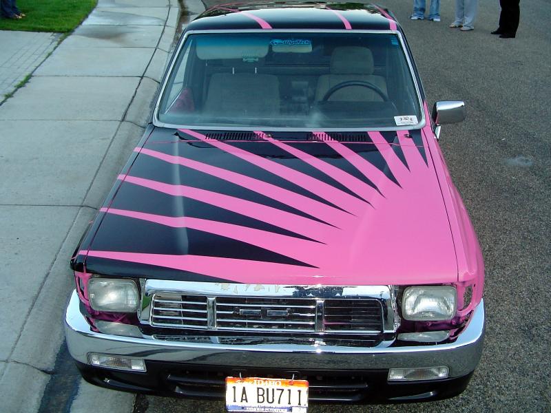 Shaved dash, fuzzy hairy pink leopardy and black door pannels, chrome shift knob(YEAH!) some other painted peices and stuff.