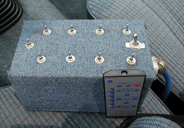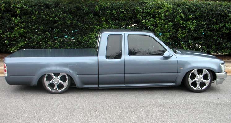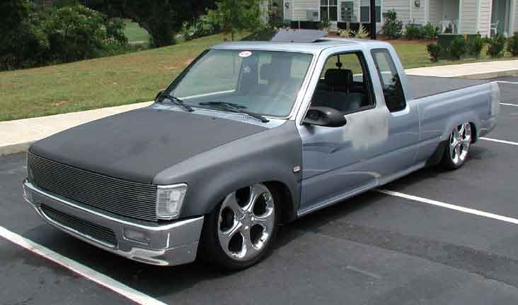Phantom grille with diamond back headlights behind it. 4x4 fenders with clear lenses, side markers. Chrome bumper/valence with billet insert. Celica mirrors. Tinted windows. Tacoma Altezza tail-lites molded in. LED 3rd Brake light. Tailgate skin with angled plate box. Rollpan. Shaved doors, antenna hole, gas door lock, rock guards. Sunroof. BMW Steel Blue Metallic paint!