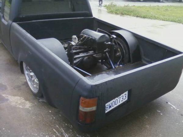 black primer, frenched lic plate, shaved gas fill door, shaved tail gate, skinned inside of bed, trailer fenders
