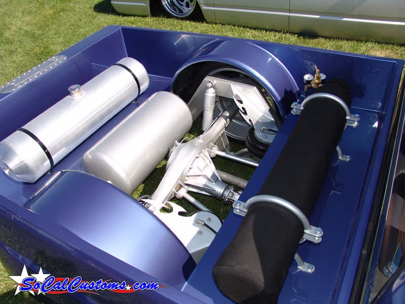 AirBags, 2"drop spindle.{KUSTOMWERKS upper and lower tubular control arms.} Custom rear clip w/cantilever, fourlink. Painted frame. 12gallon tank w/Co2 bottle. 1/2 Parker valve. Rear air shocks.