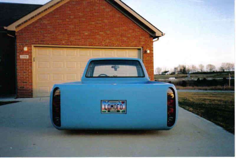 baby blue suede primer with 4runner goodies and toyota supra taillights. Oh don't forget the long bed that toyota forgot to put on the 89-95 xtra cabs.............Grant Fab combo with Supra buckets,Sir Michaels license plate box, shaved gas door, 4WD front fenders, SR5 chrome mirrors. 4 runner grill, headlights, bumper and valence.