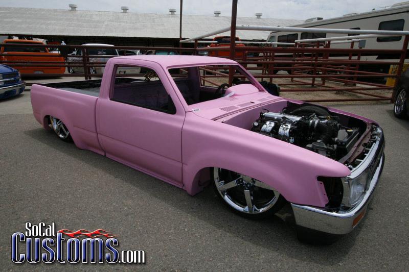 3inch stock floor/2inch traditionial, firewall smoothed, tubed, roof chopped, bed shorttened, fully shaved, 4runner grill/headlights